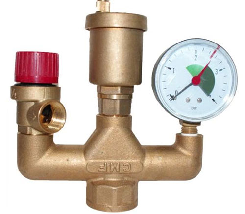 Следующее вспомогательное оборудование, это предохранительный узел, еще его называют «узел безопасности». Устанавливается он в тех случаях, если сами котлы не предусматривают в своей комплектации их установки.